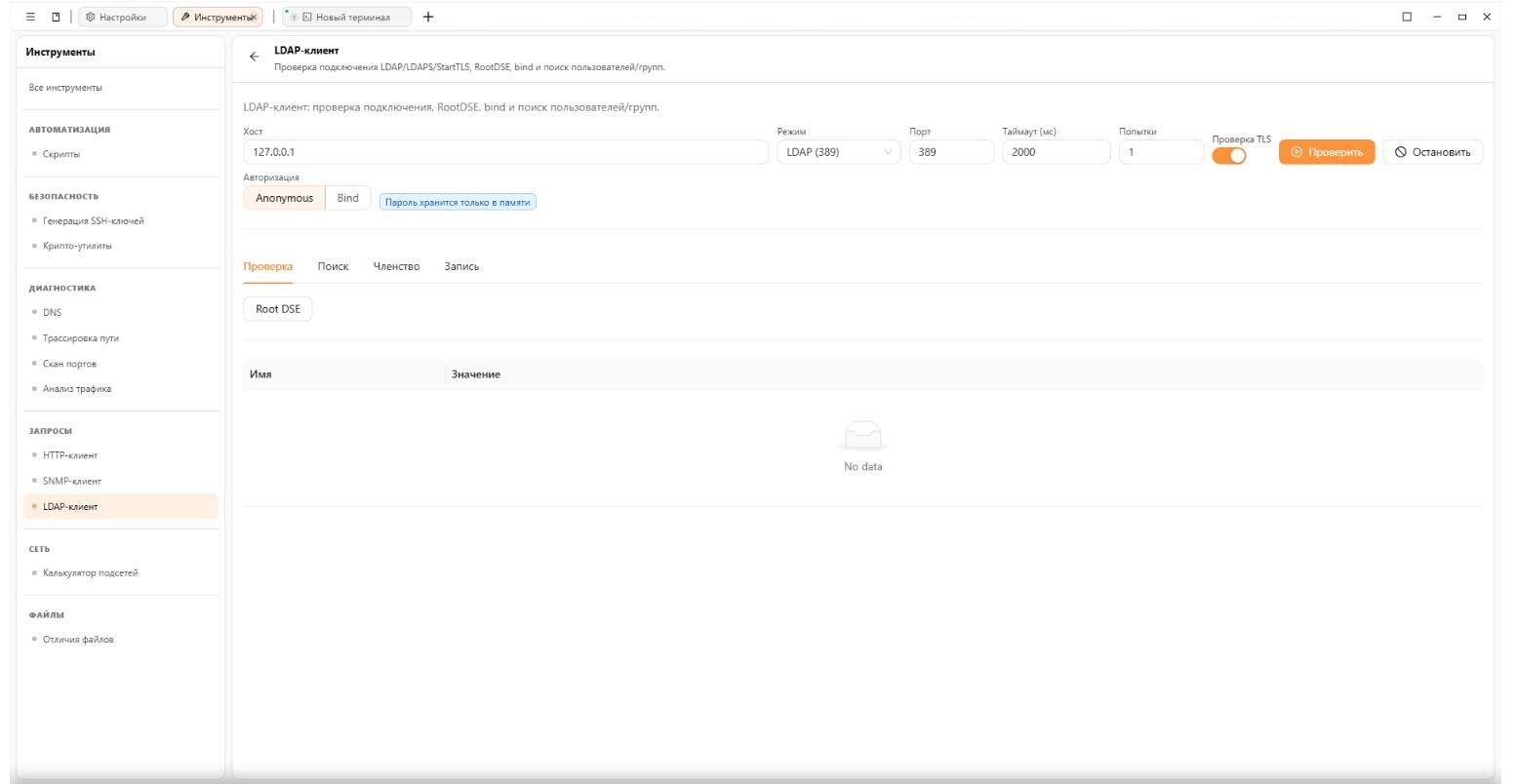 - LDAP-клиент — Проверка подключения LDAP/LDAPS/StartTLS, RootDSE, bind и поиск пользователей/групп.